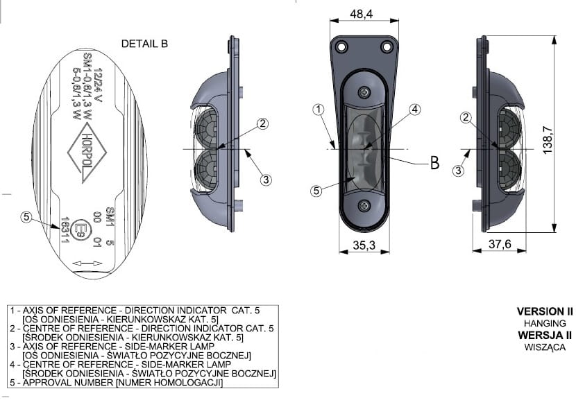 Lampa kierunkowskazu LED Kierunkowskaz boczny, wiszący, diodowy 12V/24 V (kategorii 5 ze światłem obrysowym bocznym)